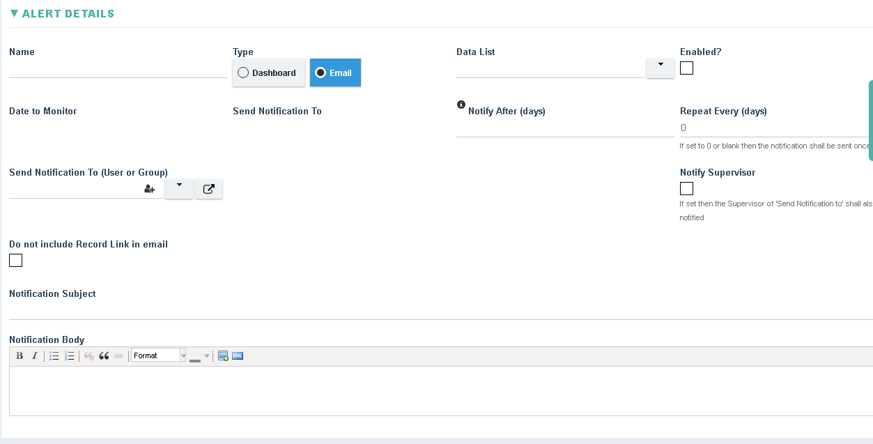 System AdministrationAlerts Creating an Alert Setting Click On the ‘Settings’ page and then click on Create New Alert. Enter all mandatory data and click save to create a new Alert. The newly created Alert shall now be visible in the Settings page. ↓ ↓